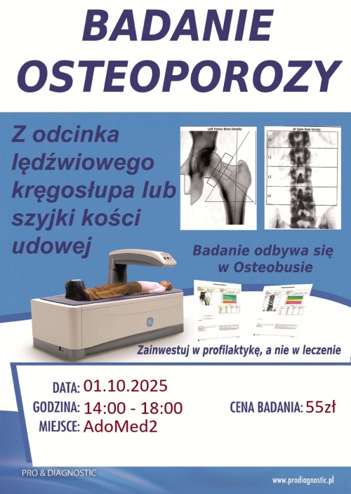 Już 1 października 2025 roku w godzinach 14:00-18:00 zapraszamy na profesjonalne badanie gęstości kości (osteoporozy), które odbędzie się w naszej placówce AdoMed 2 w Chorzowie. Badania wykonuje mobilna jednostka diagnostyczna - Osteobus.